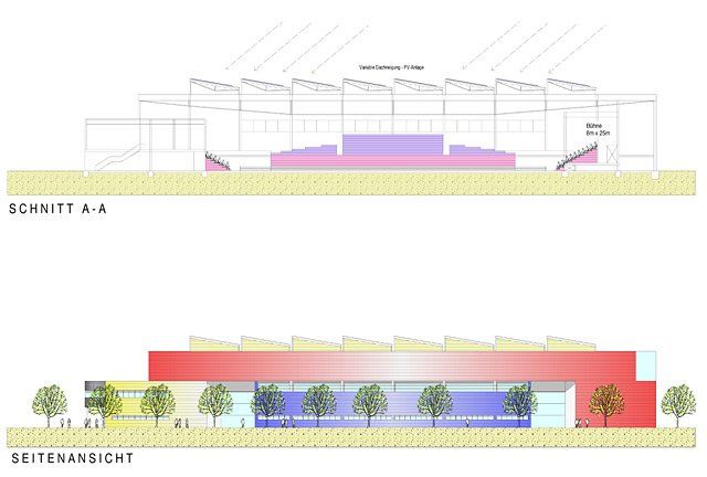 2. Idee: Die Idee den Baukörper wie einen fallenden Wassertropfen zu gestalten und zu formen, bildet die Grundlage. Dabei geht es zum einen um die ästhetischen und weichen Formen, die sich daraus ergeben, zum anderen sind dadurch im Inneren fließende ungestörte Abläufe für die verschiedenen Veranstaltungen möglich. Das Ende des Wassertropfens bildet ein sich öffnendes Mundloch über das die Betriebseinfahrt führt, um in die Halle zu fahren. Die Gestaltung der Dachform wurde in der Variante I aus dem Kontext genommen, um die pragmatische Nutzung der gezielt nach Süden ausgerichteten Dachflächen zu ermöglichen.