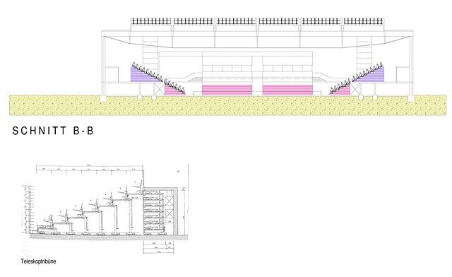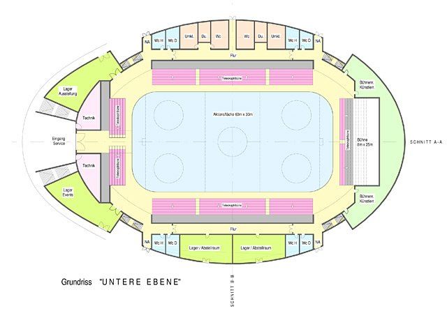 3. Das Funktions - Konzept: Eine Event - Halle sollte sich so wiederspiegeln, dass Sie für alle denkbaren Nutzungen einfach und schnell zu wandeln ist. Insbesondere der Kosten- und Personalaufwand sind dabei zu beachten. Unser Konzept sieht vor, die Arena in 2 Ebenen zu gliedern. Die untere Ebene unterliegt ständigem Wandel und Veränderung und kann durch die Anordnung der Flächen und Räumlichkeiten alle Wünsche erfüllen. Die obere Ebene rundet die Funktionseinheit Arena ab und wird somit von den Umbauarbeiten so gut wie nicht tangiert. Dadurch werden dort aufwendige Aufräum- und Reinigungsarbeiten vermieden.